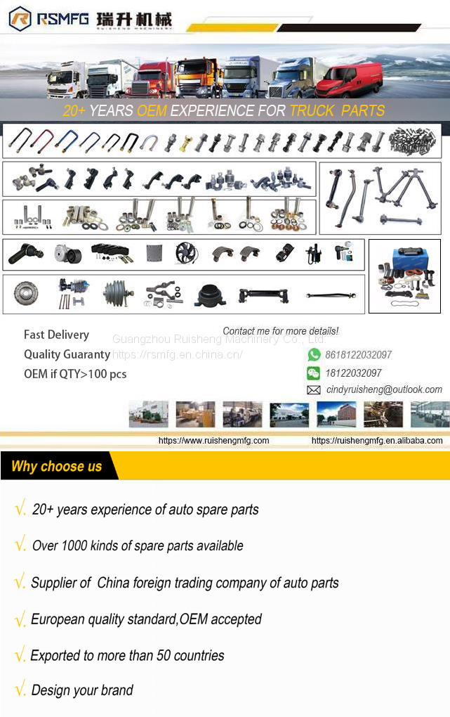 RSMFG is producing bus and truck spare parts in China,over 20 years OEM experience.We supply different types of Bus & Truck spare parts model to fulfil different customer's need.They are suited for brands as follows:Higer,BYD,Young Man,Zhong Tong,Ankai,Sunlong,Yutong,King Long,Golden Dragon,Neoplan,FotonRenault,Scania,Man,Volvo,Mercedes-Benz,Hino,DAF,Isuzu,Iveco,Mitsubishimaybe you are looking for a new supplier?please feel free to contact me for more information. Skype:LALA11151,Mail:cindyruisheng@outlook.com